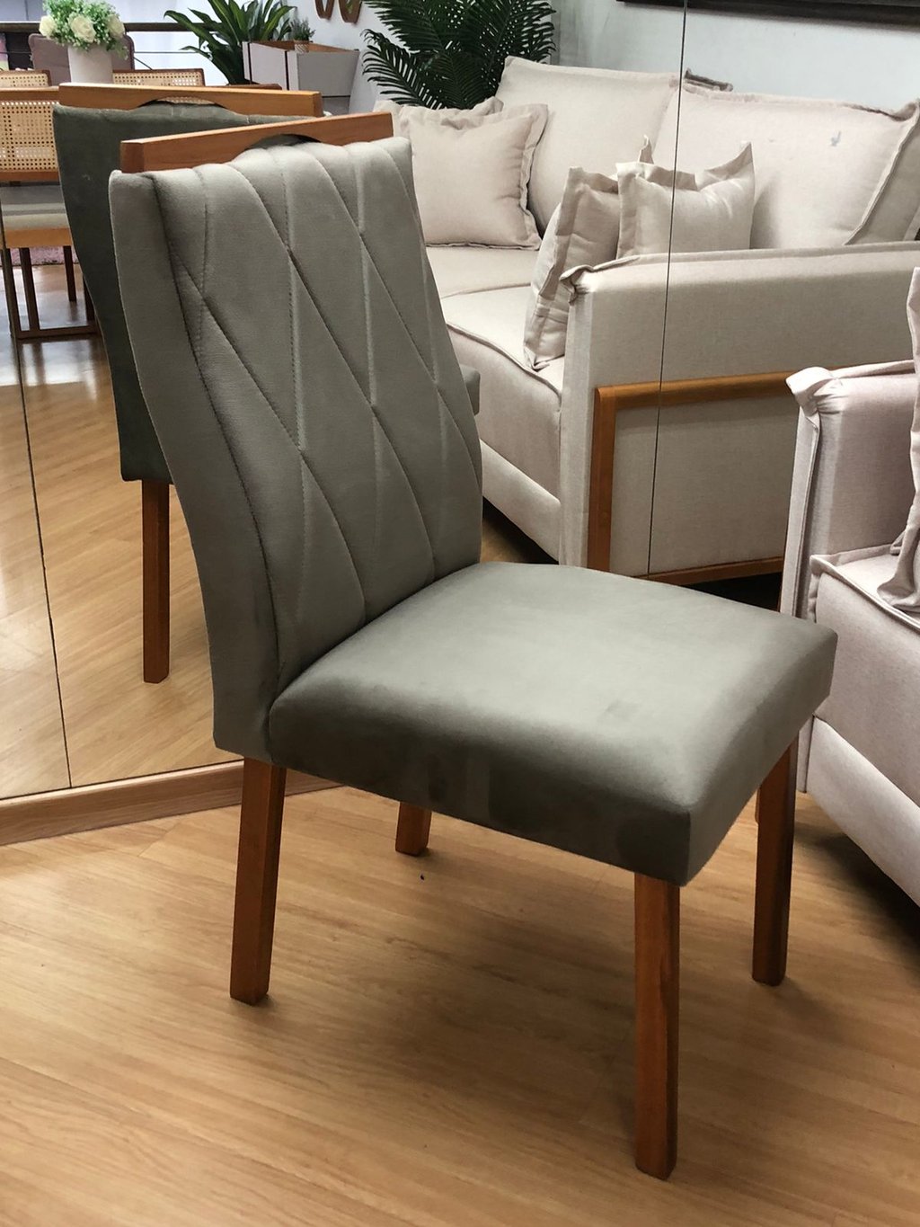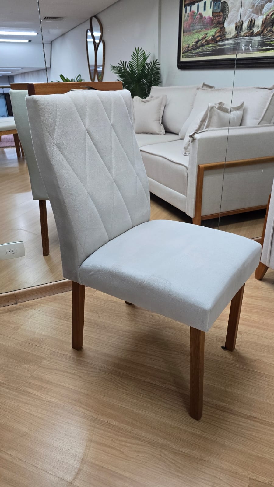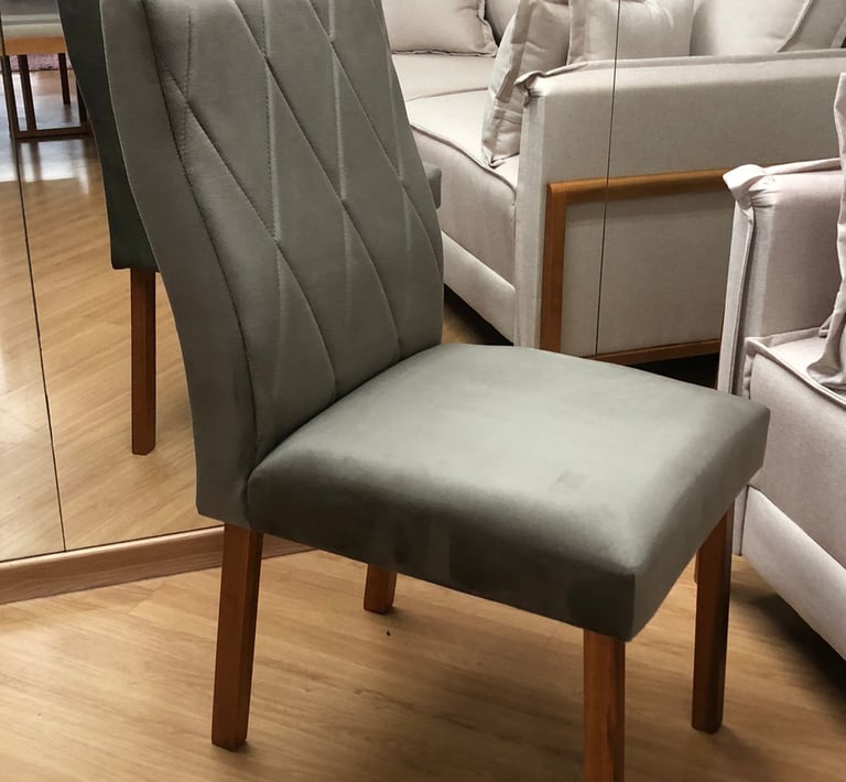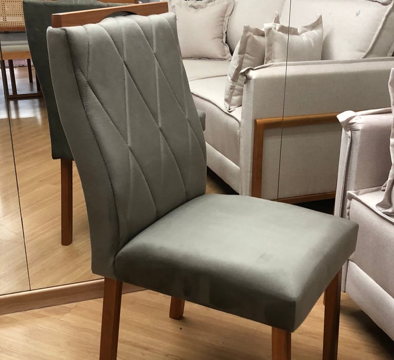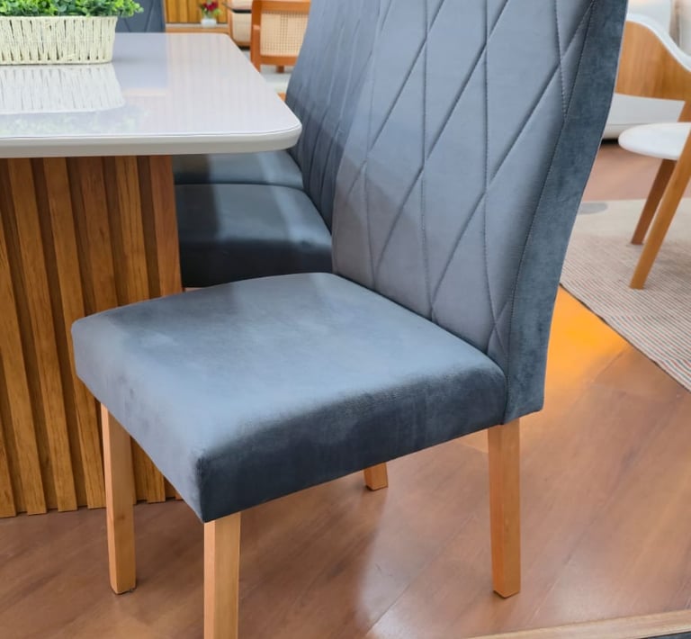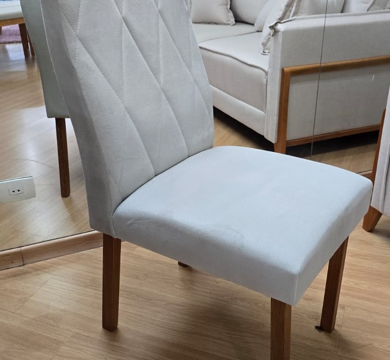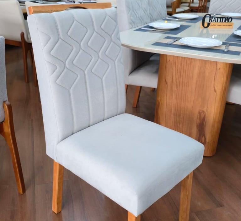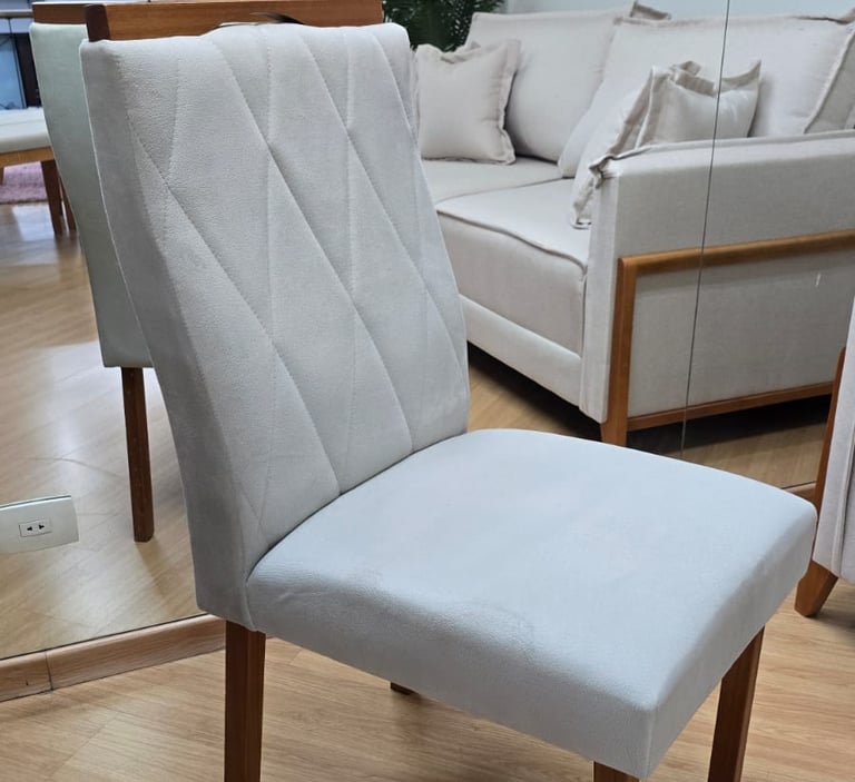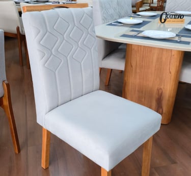Assentos e encostos são revestidos com tecido veludo, temos a pronta entrega nas cores off White ou Cinza.