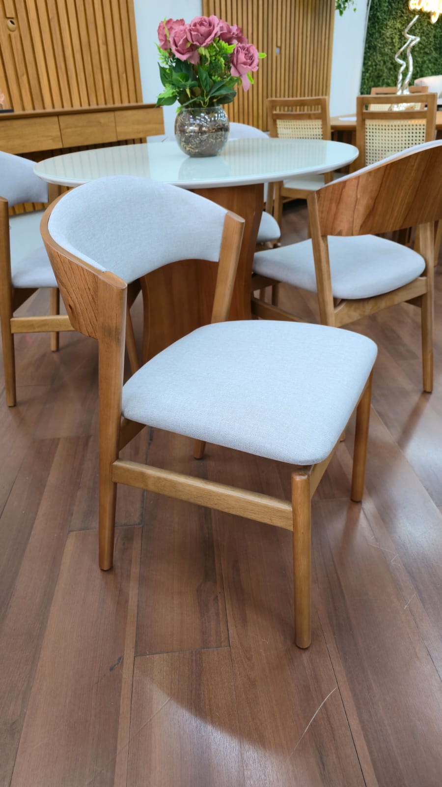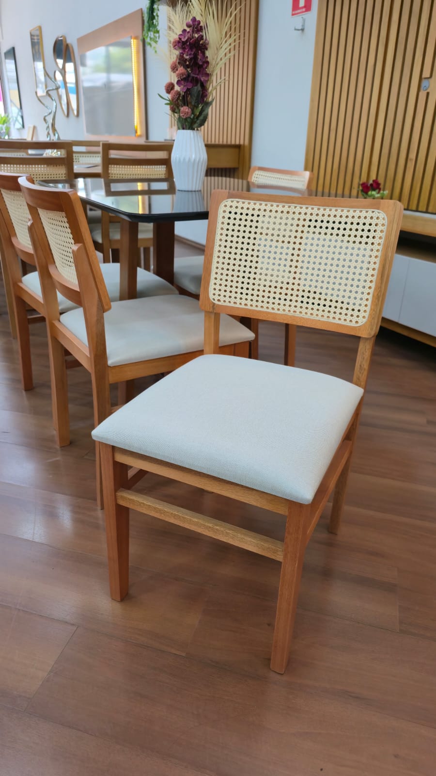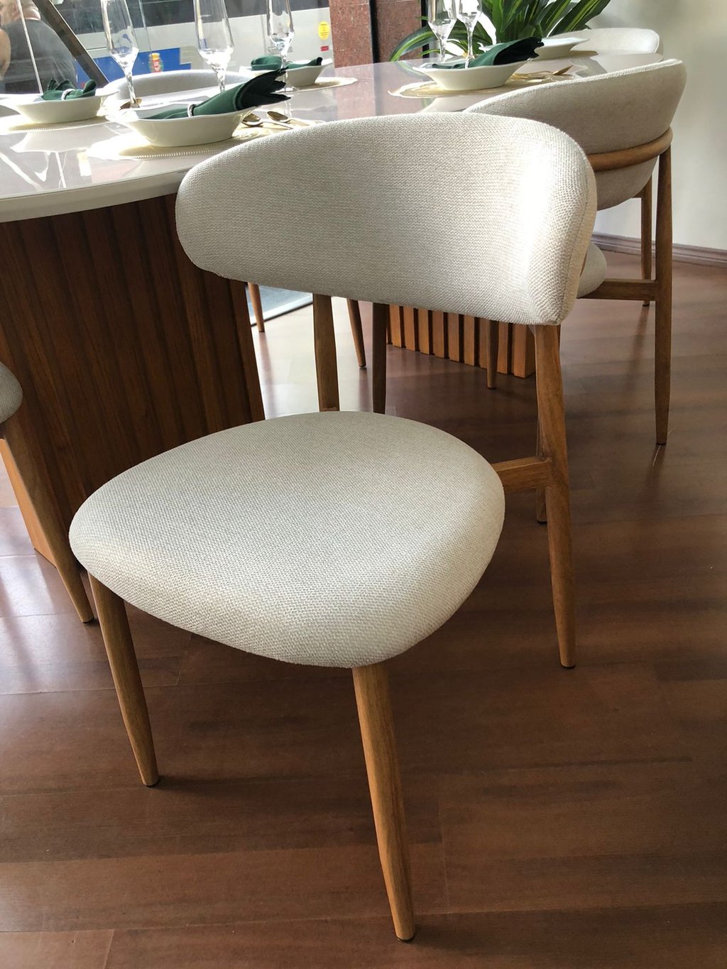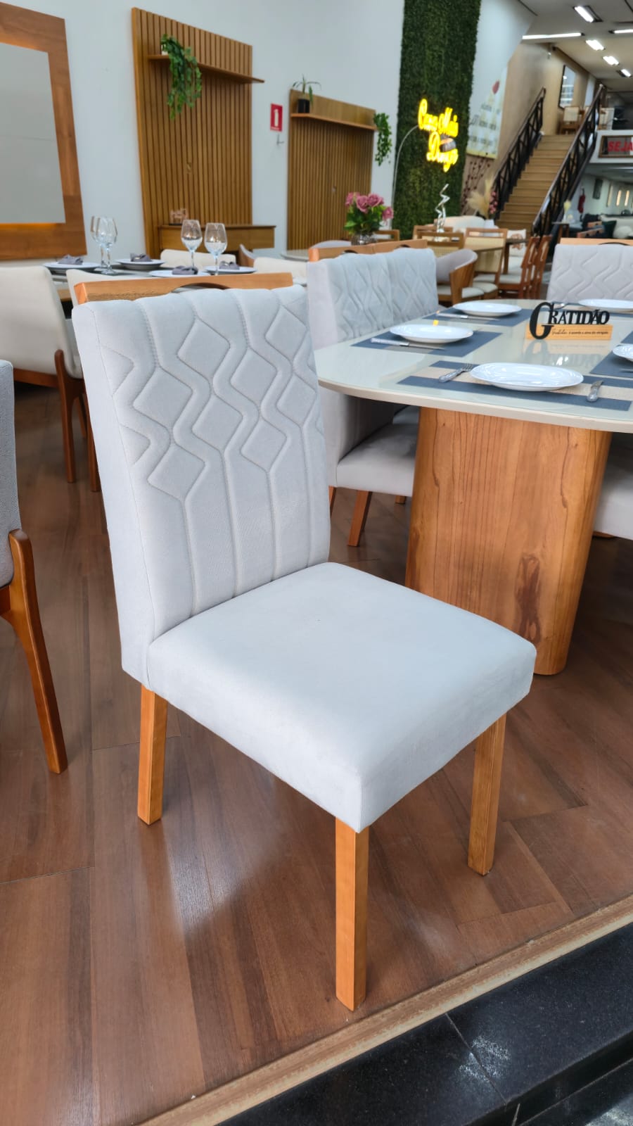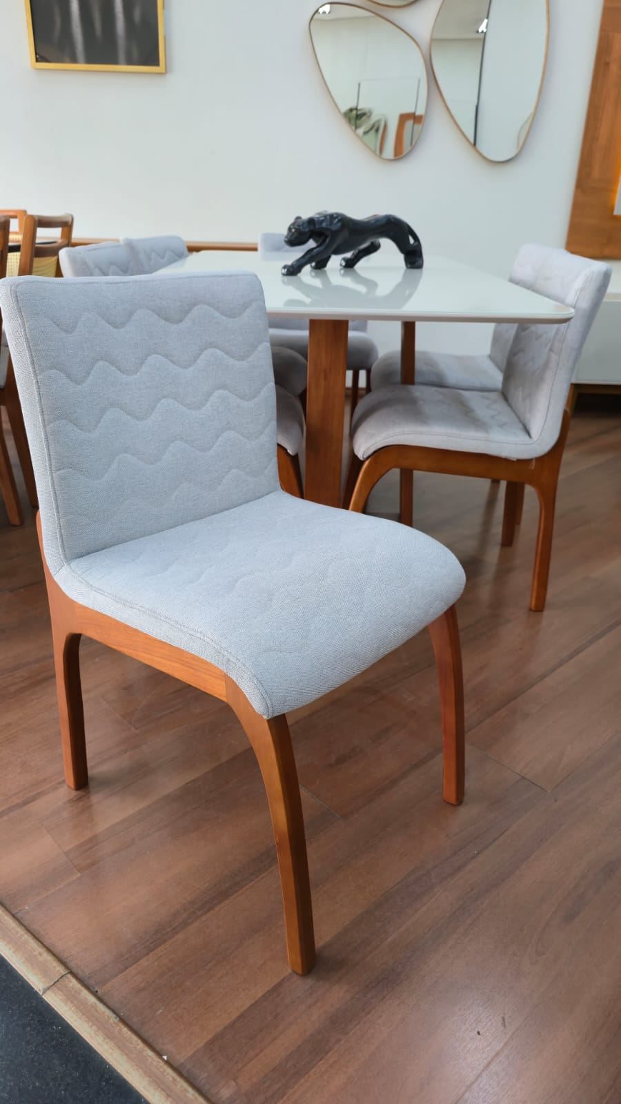 As Cadeiras Lisboa possuem detalhe de madeira na parte superior do encosto podendo ser usado como puxador evitando o contato direto com o tecido.